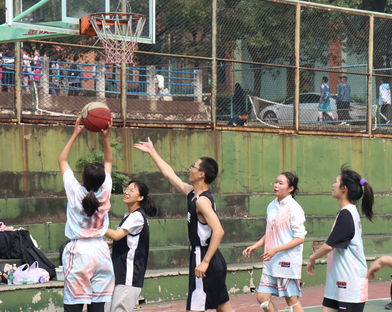 比赛进入最后一场,场上氛围愈发紧张,场外的喝彩声也一浪高过一浪。中文二班6号龙思圪体力不减,反而越发迅猛,突破层层防线,凭借惊人爆发力六次进球。中文二班的球员们默契配合,传球给8号龚彬,篮球在空中划出一道道完美的弧线,实现四连进。新闻二班的球员们积极防守,展现出赛场上迎难而上的奋斗精神。