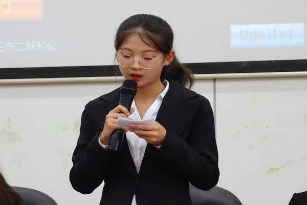 现场气氛迅速升温,紧接着进入正反双方驳论环节。正方二辩曾诗雨主张新闻价值具备伦理性,即新闻报道内容必须符合社会主义核心价值观。她抓住新闻道德的范围,指出将违背社会道德和法律的低俗新闻归为新闻价值的错误。反方二辩王世姣提出新闻道德是新闻工作者的行为规范,新闻道德可以推动新闻业的良性健康发展,保障新闻工作者有正确价值观,传播促进社会进步的新闻。随后正方三辩唐若兰向反方一辩张逸、反方二辩王世姣、反方四辩谢佳佳展开质询。她慷慨陈词,抒发己论,接连抛出多个犀利的问题,反方辩手回答也思路清晰,双方辩论迸射出智慧的火花,出色的思维表达能力赢得现场一阵又一阵的掌声。