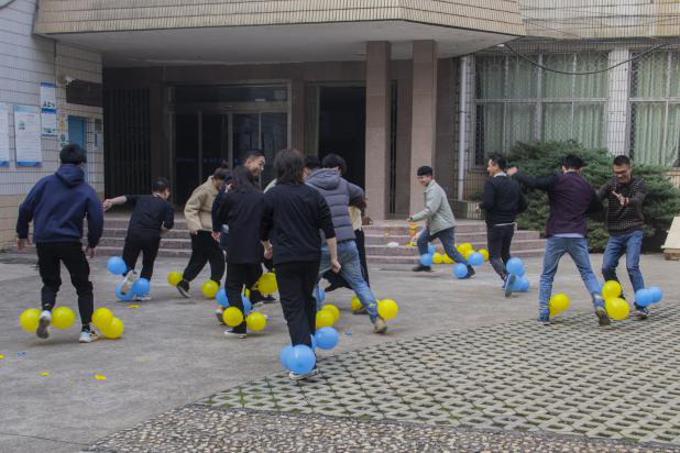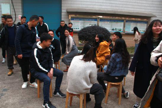 随后,户外游戏活动正式开始。同学们在主持人的引导下来到游戏活动场地,根据节目表演开始前在现场抽签的扑克牌花型,分为四个队:红桃队、黑桃队、梅花队与方块队,每队十五人。在四位队长的带领下,各队队员摩拳擦掌,跃跃欲试。