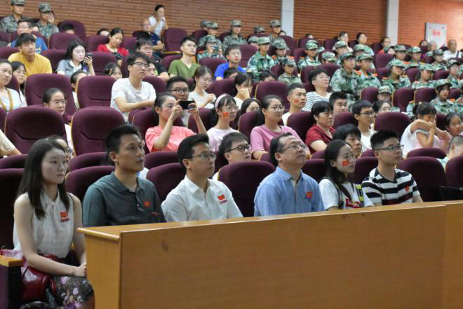 随着李克强总理一声“全场起立、鸣礼炮”的指令,56门礼炮,70响轰鸣,响彻云霄,述说56个民族的中华儿女,70载春华秋实的拼搏。随后举行庄严的升旗仪式,全场师生随着歌声不约而同地站起来,对冉冉升起的五星红旗行注目礼,唱国歌,嘹亮的国歌声在报告厅中回荡。