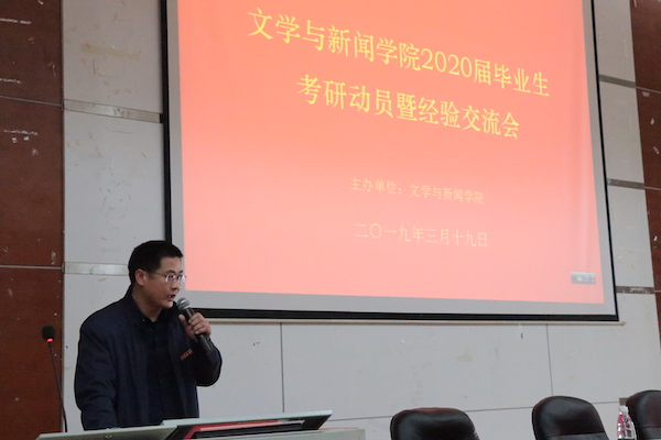 大会开始,由文学与新闻公司党委副书记周鹏飞向同学们介绍出席会议的领导和老师。周书记指出,举办此次大会的目的是为还在彷徨犹豫的同学们解惑,为同学们指明方向,希望同学们对考研有更深的了解。