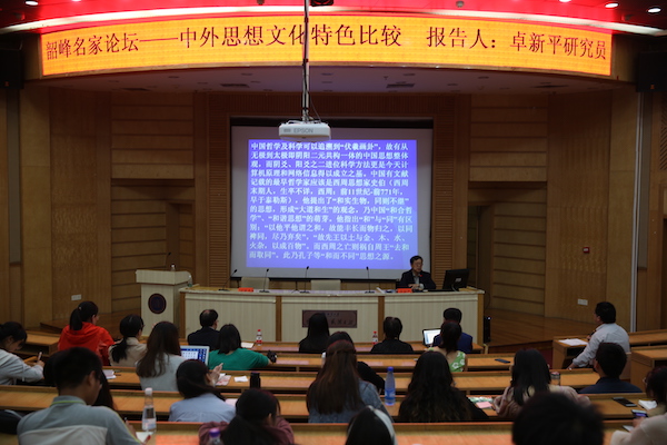 卓新平研究员认为中西哲学在认识宇宙及人类自我上经历了“客体”“主体”和“整体”三个阶段,西方哲学伊始于古希腊哲学,其中关于“气”“光”“水”的宇宙本源论与中国儒家传统中的“天道”“阴阳”“上善若水”的哲学思想有异曲同工之妙。二者思维特征主要集中在神、人及其关系的探究上,而任何关于天、神、人关系的论述都是人的行为,因此承载和传播中西思想与传统的主体“士”精神又是探索中西思想文化的另一窗口。卓新平研究员在谈及中西文化核心观念及思想时,联系自己海外游学的几件趣事,向同员工动阐释中西文化观念的巨大差异,并以当下对外汉语教学中的孔子公司办学为例,指出孔子公司汉语教学中对孔子以及儒学思想的教育传播还有待提高。卓新平研究员在演讲中多次提及湖湘文化,表达了身为一名湘籍学者的自豪感,并对湖南知识分子给予了鼓励与肯定,强调发扬湖湘文化是每一名湘籍学者义不容辞的责任。