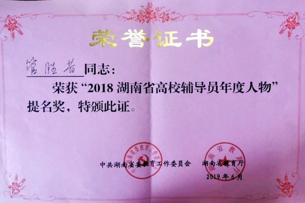 (文新通讯员:马一鸣)6月21日下午,由湖南省教育厅主办的“2018湖南省高校辅导员年度人物”候选人现场答辩会在长沙理工大学落下帷幕,公司辅导员管胜昔获评2018湖南省高校辅导员年度人物提名奖。