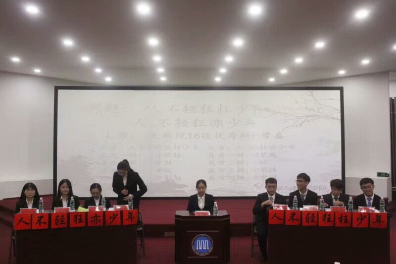 听过了周书记的发言,看过了辩论队的风采展示,期待已久的表演赛来了。本次辩论赛表演赛的辩题是“人不轻狂枉/亦少年”,文新院16级优秀辩手曾嘉担任主席。正方是由一辩土木院优秀辩手肖依林,二辩文新院优秀辩手曾勃,三辩土木院优秀辩手黄权,四辩文新院优秀辩手郭彤旭组成的全员恶人队,他们的观点是“人不轻狂枉少年”。反方则是由一辩文新院队长彭紫薇,二辩文新院优秀辩手卢琦,三辩文新院肖家情,四辩文新院优秀辩手廖雪丽组成的知心姐姐队,她们的观点是“人不轻狂亦少年”。