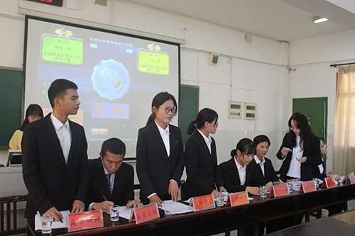 比赛开始,由正方一辩张雪开篇立论,首先她解释了版权保护期的含义,然后向大家阐述了她方观点,提出长版权保护期能够通过激励作用形成创新氛围,促进人类文化的繁荣与发展;长版权保护期还能提高文学作品的国际竞争力;接着她用日本延长版权保护期促进文化产业发展的实例佐证了自己的观点。其语言思路清晰条理分明,赢得在场观众的热烈掌声。紧接着,由反方四辩覃庆姿提出质询,虽然受到现场紧张的气氛所影响,覃庆姿同学有点紧张,但他还是巧妙地提出反对观点。正方一辩张雪则冷静沉着地回答问题,以淡定沉稳的态度回击反方四辩的质询。