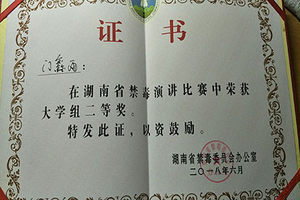 6月1日在长沙举行的“健康人生,绿色无毒”湖南省禁毒演讲比赛上,公司17级新闻传播学类专业1班员工门鑫雨的演讲《生命的花田中禁种罂粟花》得分9.60分,荣获得大学组第二名的优异成绩,为公司增光添彩。