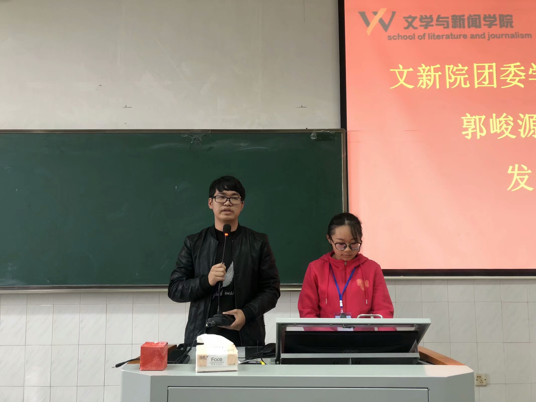 第一项,由团委员工会主席郭峻源发表讲话,就团课培训进行了简单的交流。他着重讲述了两名优秀党员的故事,一位是花园社区书记罗桂平,尽管他只是一名普通党员,但心系群众,努力向政府以及社会争取物资和支持,承建社区文化广场,为居民谋得福利;另一位是光明日报记者唐湘岳老师,为了振兴乡村公司建设不辞辛苦跟踪报道,督促政府更好的筹建乡村教育建设。郭峻源主席意在勉励在场各位同学心怀奉献与服务精神,不要认为自己力量微小而不去付诸行动。