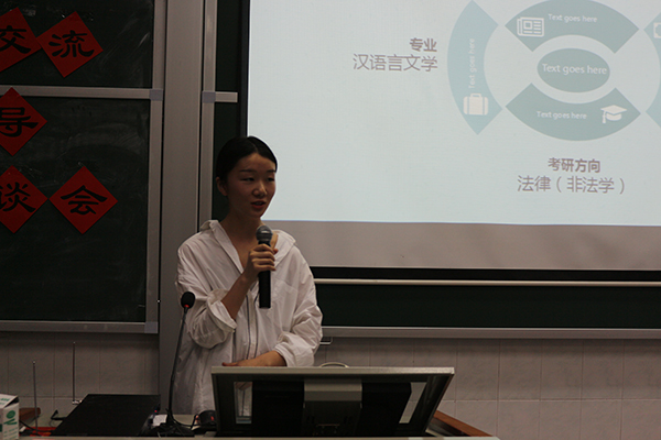 第二个环节则是由14级学姐进行经验分享。首先上台进行经验分享的是保研到中国人民大学比较文学与世界文学专业的刘彦辰学姐,她从实力要与公司匹配、专业要跟兴趣走等方面给大家提出建议,告诉同学们要多逛考研贴吧,看各种各类书以备面试等小技巧,并且介绍了自己面试与笔试的一些小经验,告诉大家“即使别人都否定你,你也不要否定自己”。第二位是保研到暨南大学新闻与传播专业的曹文昱学姐,她在发言中为我们介绍了公司对于保研的具体要求以及关于论文发表的具体事项,并为大家讲解了一些基本的概念。最后,曹文昱学姐为大家推荐了《传播学教程》和《新闻学概论》两本考研教材。第三位是考研到中南大学法律(非法学)专业夏宁学姐,她为大家介绍了法硕的具体概念,并且为大家普及了该专业的特殊性以及报考的要求。第四位是考研到中国传媒大学新闻与传播(国际新闻方向)的张聪学姐,她为大家介绍了自己的学习方法,提醒考研员工要有计划有安排的复习,并注重时事热点用理论和热点结合多方获取信息。最后一位则是考研到sunbet申搏中国语言文学的王菊玲学姐,她主要讲了考本校的优势以及学习方法,并针对自己的考研经验为同学们建言献策。在提问环节,针对同学们的各项问题,她们还分享了答题技巧等等。