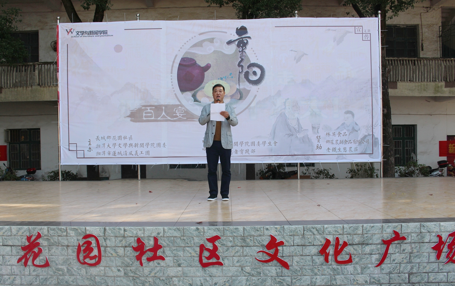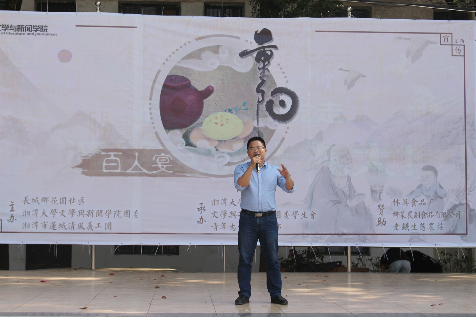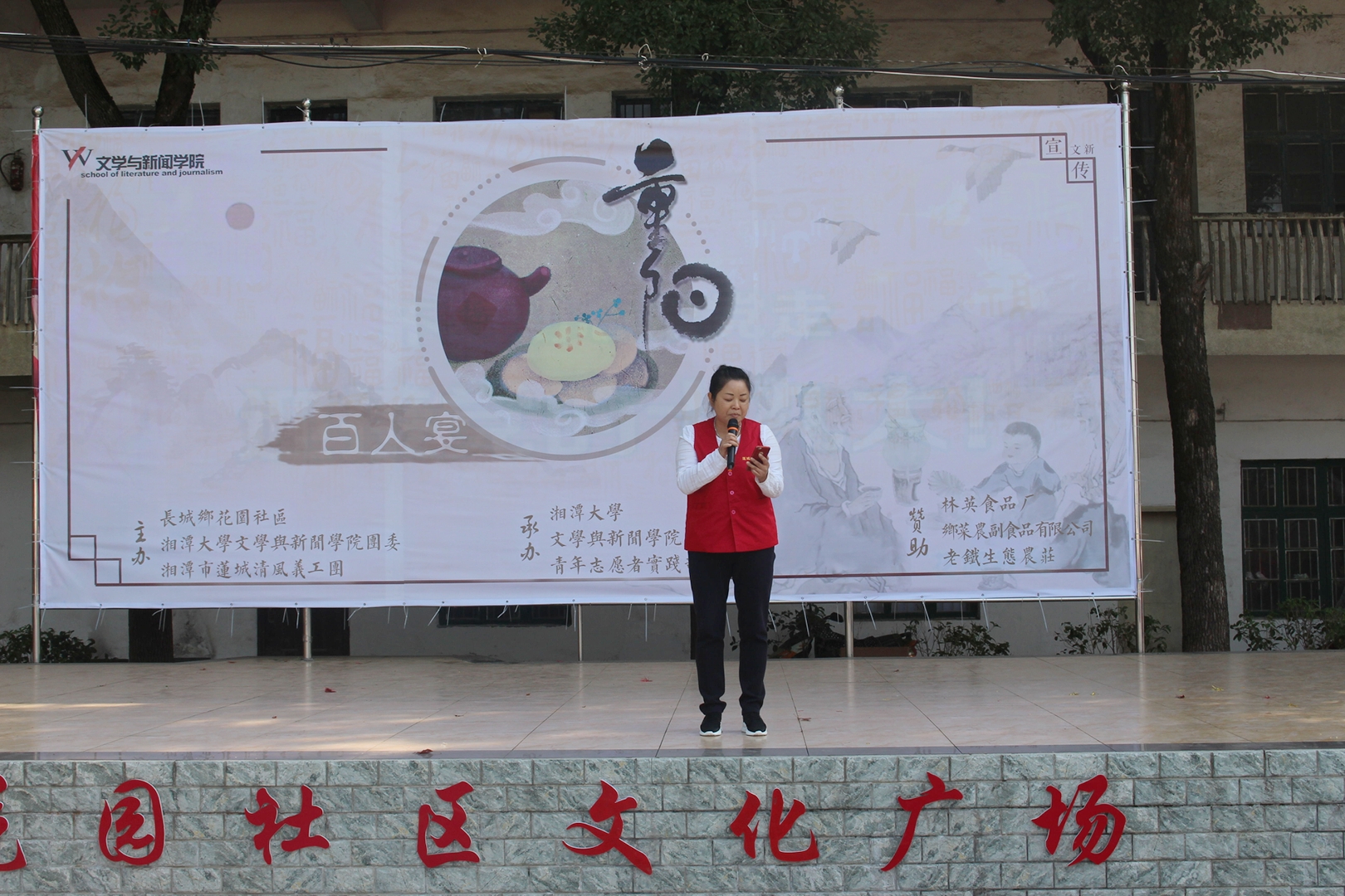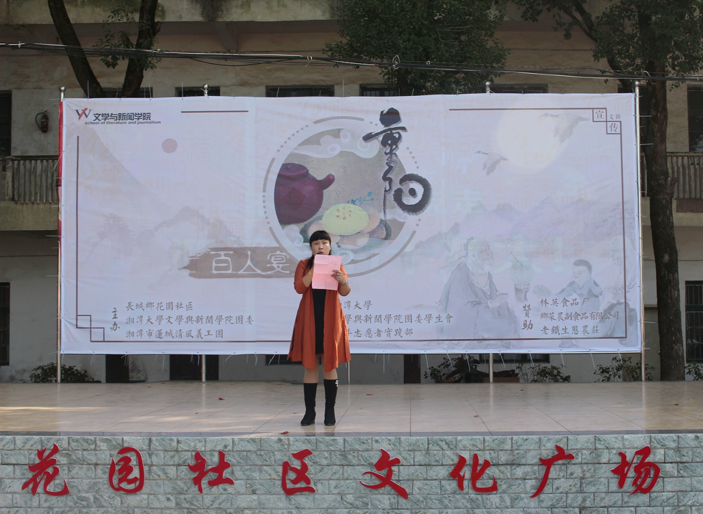 10月28日正逢重阳佳节,为贯彻落实党的十九大精神,践行社会主义核心价值观,营造“尊老、敬老、爱老、助老”的良好社会氛围,sunbet申搏联合湘潭市长城乡花园社区、湘潭市莲城清风义工协会在花园社区文化广场共同举办了“重阳百人宴”活动。参加此次活动的领导有:长城乡党委副书记田韬,长城乡副乡长许迎春,文学与新闻公司党委副书记陶永峰,sunbet申搏团委书记管胜昔,sunbet申搏学工办老师王旭,莲城清风义工协会财务部长罗伏文,花园社区书记罗桂平以及花园社区主任颜德林。花园社区居民、莲城清风义工协会、sunbet申搏师生共计200余名欢聚一堂,共度佳节。