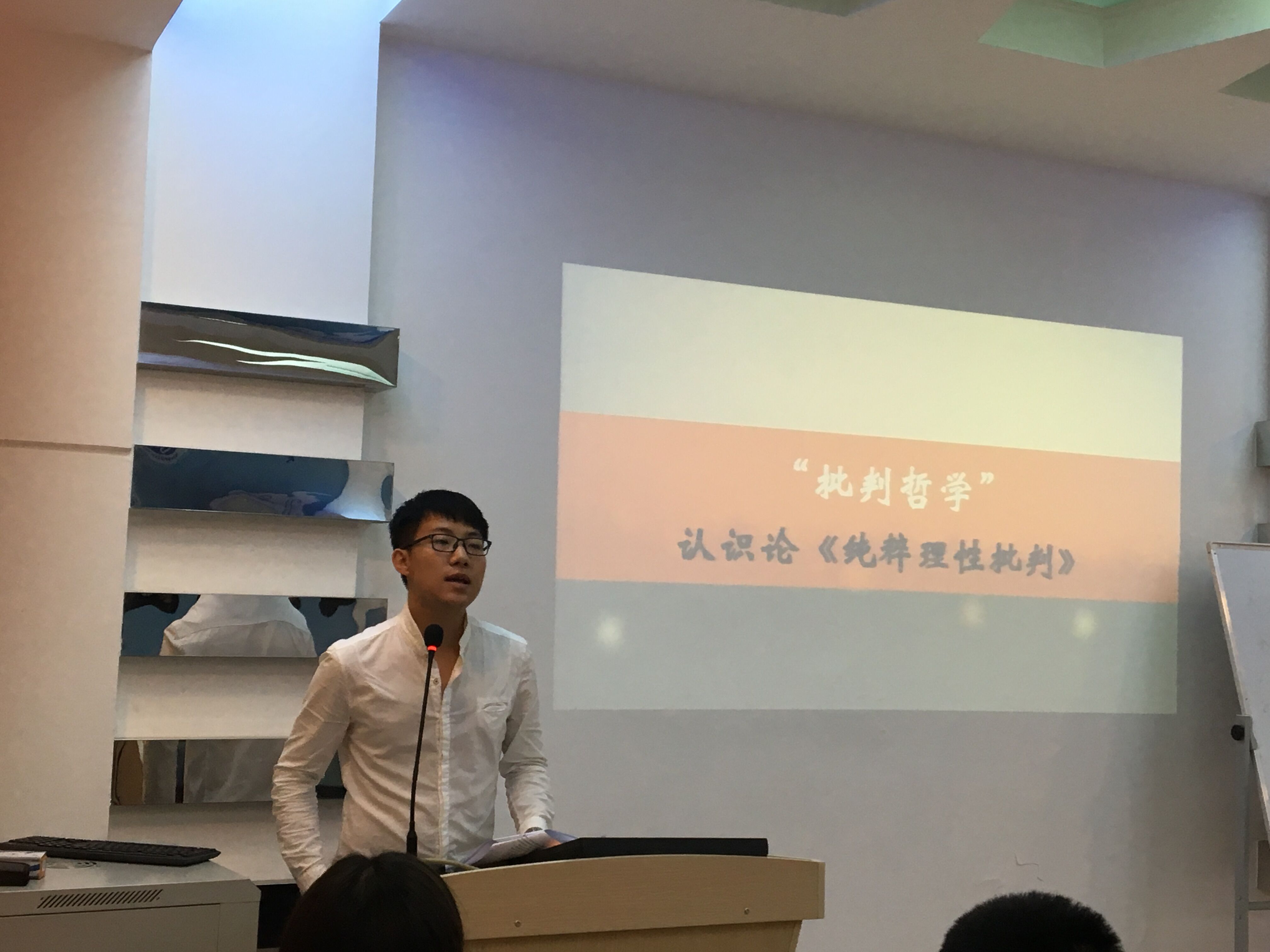 接下来是2015级的宋昆阳同学,他讲述的康德的判断力批判,他从“前批判时期”的自然观及批判哲学形成、批判哲学的认识论:《纯粹理性批判》和批判哲学的道德哲学:《实践理性批判》这三个方面入手,深入浅出,用通俗易懂的生活实例帮助同学们理解。
