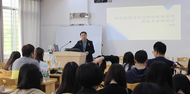 4月23日晚,湖南广播电视台旅游频道活动产业部主任、大公报湖南分社首席记者唐竟淳应公司邀请,在文科楼318会议室为公司员工作了题为“报纸新闻写作与网络新闻写作的差异分析”的精彩学术讲座。讲座由研究生会主席杨文博主持。