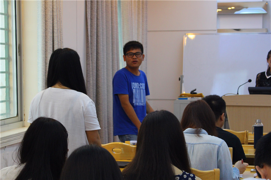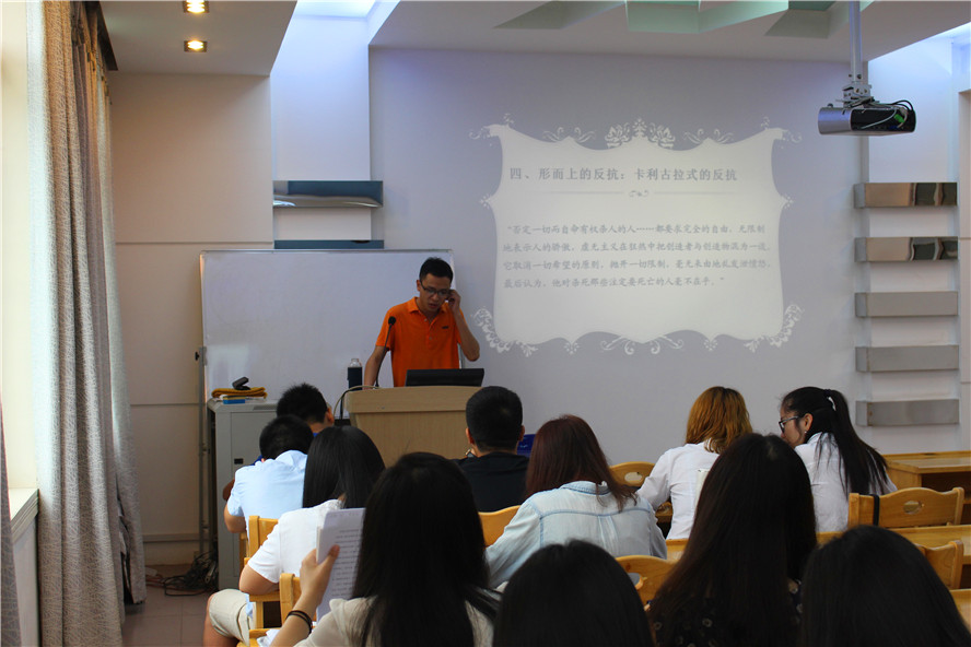 在论坛上,第一位进行学术演讲的是来自比较文学的杨开润。他所讲述的是《浅析加缪戏剧中的反抗之美》,他通过对加缪作品《局外人》、《反抗者》等戏剧情节的分析,来看在渗透在戏剧之中的“形而下学”的反抗之美。通过加缪的反抗哲学看到人类所处的一种荒诞处境,同时感受加缪对于人生的生存状态和生命价值的密切关注。