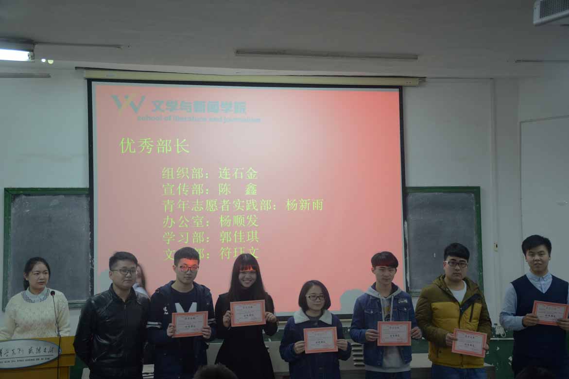 紧接着进行大会的颁奖仪式,团委第一副书记白露为优秀部门颁奖,主席杨锦涛为优秀部长颁奖,团委第二副书记张一琳为优秀干事颁奖。