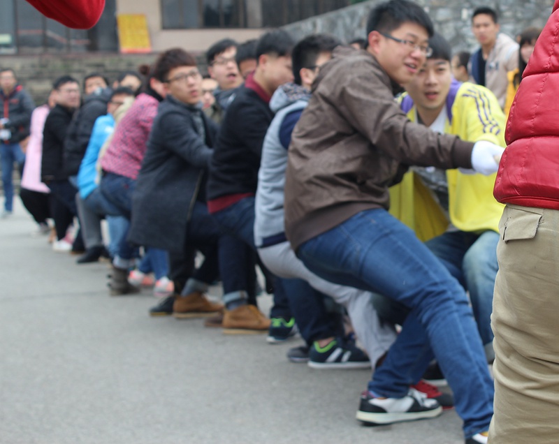 当比赛的哨声一想起,队员们双手紧握长绳,憋足了劲拼命往后拉,到场的同学们也在队伍旁助阵加油,恨不得抓起绳子跟队员一起努力。一时间场上号子声、呐喊声,此起彼伏,飘荡在俱乐部上空。