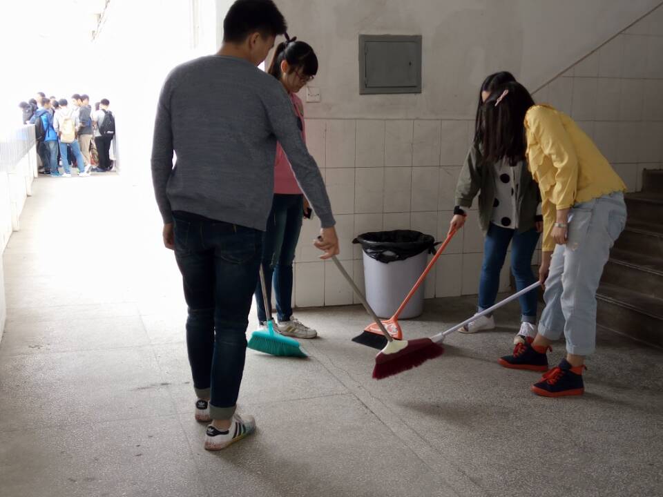 同学们首先清扫了走廊,扫去灰尘与垃圾,还有细心的同学对掉落在楼梯上的墙灰进行打扫。另一部分同学拿着抹布擦拭墙砖。经过近二十分钟的勤劳工作,楼梯以及走廊里已看不到任何垃圾,十分干净。
