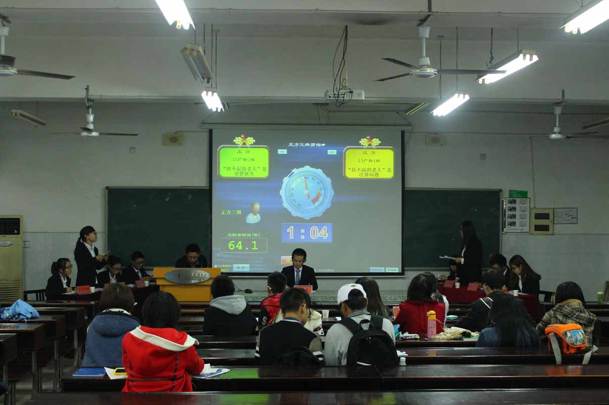 参赛双方分别是正方15广告二班,辩手分别是:一辩王文豪,二辩何松娟,三辩何圆圆,四辩杨哲,观点是“扶不起的老人”是道德缺失。反方15广告一班,四位辩手分别是:一辩吴丽安,二辩张昉,三辩彭伟,四辩李卉琳,观点是“扶不起的老人”是法律问题。通过一场激烈的辩论,最终15广告二班获得了最终的胜利。