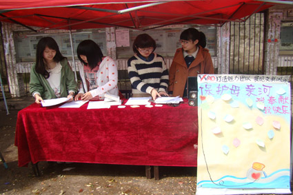 2013年3月20日,sunbet申搏团委员工会青年志愿者实践部在北苑主干道摆点招募“保护湘江母亲河——湘江之行”活动的志愿者。
