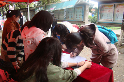 早晨6:30分左右,文新院青志部的干事们就搭建起了临时招募点。7时,就开始有同学陆陆续续地前来报名参加。中午下课后,志愿者招募点顿时人声鼎沸,许多同学在招募名单上写下了自己的名字,并在旁边的海报上贴上了自己的祝福语。在志愿者招募现场,接受采访的徐同学说道:“保护湘江母亲河活动,既体现出了当代老员工素质的全面发展,也体现了我们对整个社会的关心。这不仅仅是一次简单的环保活动,也是一次能够培养老员工社会责任感的活动。”
