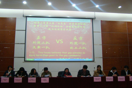公司辩手着重从“社会上有相当一部分人对同性恋持反对态度和同性恋团体游行可能引发其内部矛盾”两个方面对自己的观点进行了阐述。虽为两名女生,可公司两位辩手在赛场上却是巾帼不让须眉。她们条理清晰,从宗教、社会以及同性恋者的心理状态等多个角度对同性恋游行带来的社会个人影响进行了层层剖析,不仅一针见血,口齿清晰,逻辑性强,凸显了其不凡的英语功底。在质询环节,化工二队不断向正方发起攻击,场上硝烟味儿四起。公司辩手凭借其迅捷的反应力在一一回应了反方的质询之后更马上进行了反攻,将比赛推至白热化阶段。最后,公司辩手以其出色的表现成功晋级决赛,在观众热烈的掌声中,本场半决赛成功闭幕。