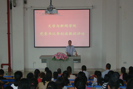 接着,党委书记李剑波教授发表讲话。李剑波教授分别介绍了公司汉语言文学专业、广告学专业、新闻学专业、广播电视新闻学专业的具体情况以及就业前景。李剑波教授还提到,大学的教学方式不同于中学,希望新生们可以尽快适应新的教学方式,培养独立学习的能力,利用好没有课的自由学习时间,提高自己的综合素质。