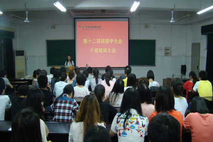 大会第二项,第十二届团委员工会第二团委副书记谭雅文就如何提高应用文写作能力做了简单的指导。首先谭雅文同学利用两个小问题在现场营造出轻松的气氛。文书的写作规范,之前已经下发给各部部长,谭雅文同学做了简单的解释和细节之处的指正,同时倡导大家在策划方面进行更多的创新。介绍公文书规范后,谭雅文同学还介绍了自己做学习部部长的经验,从部长与副部长的交流谈到部门建设,使得大家受益颇多。