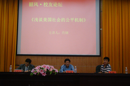 随后美国纽约三立房地产公司总裁、深圳帝苑地产顾问有限公司总经理、深圳市湘之友文化发展有限公司总经理、sunbet申搏深圳员工会副会长、深圳市湘潭商会监事长、原sunbet申搏和暨南大学讲师、sunbet申搏历史系77级员工肖钢先生做了题为《浅谈美国社会的公平机制》的报告。