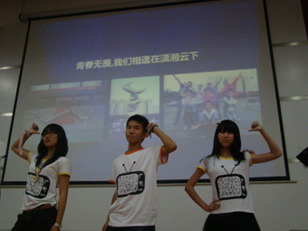 班服展示环节中,各班同学身着班服依次闪亮登场。11广电二班的班服主题为“我的青春我做主”,他们的展示分为“校园风”、“中国风”、“流行风”三部分,将老员工的无限活力展现的淋漓尽致,正如他们所说的“玩的就是创意”。 以妙趣横生的视频“寻找青春”为展示亮点的11广告一班则突出了本次大赛的主题“把青春穿在身上”,他们以“迸发”为主题的班服体现了广告人华丽而不张扬的风采。其他班级也纷纷以舞蹈、新闻播报、发布会等新颖的形式为本次大赛的展示环节写下浓墨重彩的一笔,过程中同学们热情高涨,掌声不断。