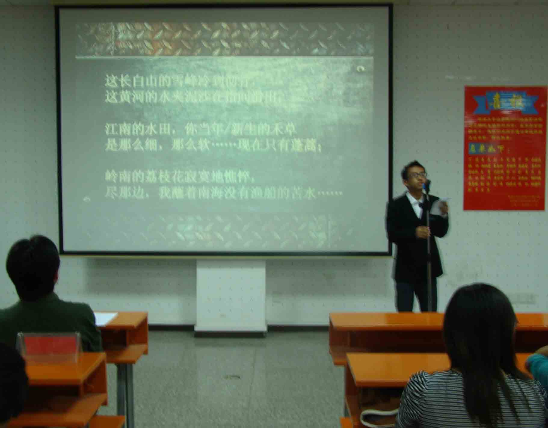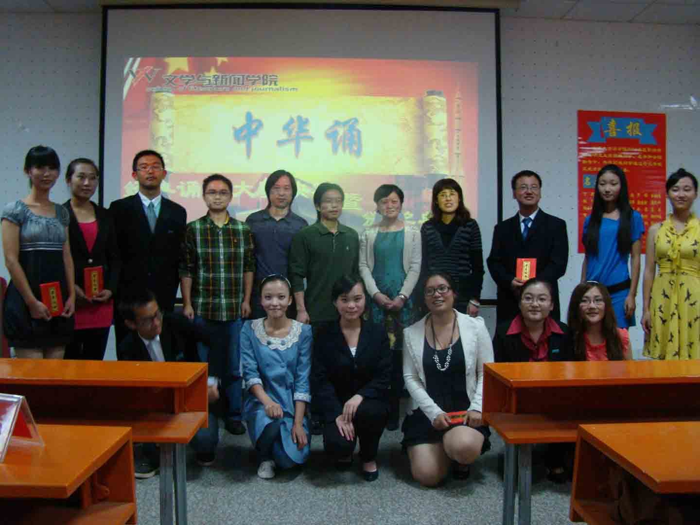 大赛在满江的一曲《中华颂》中拉开序幕,12位在初赛中脱颖而出的选手新颖地利用VCR的形式,进行了与众不同的自我介绍,并合唱一首《爱我中华》与大赛主题相应。随后,12位选手身着正装依次按序号上台朗诵。其中,来自11广电二班的3号选手于淼淼以饱满的感情朗诵了《祖国,或以梦为马》,赢得阵阵掌声。9号来自10中文一班的秦毅用真挚的感情将北岛的《回答》演绎得淋漓尽致,将全场气氛推向高潮。此外,亲友团们的表现也相当活跃,“挑战地心引力,引爆广电魅力”喊出了广电班的独特与自信,“精神龙马,气势如歌。披荆夺冠,唯有马歌”等一句句新颖响亮,气势如虹的口号将大赛气氛一度抬高。