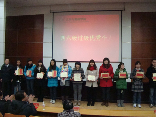 获得科研奖的老师有刘中望和朱军;获得教学奖的老师有何纯、盛新华和孙丰国;获得优秀管理工作者的是李军华老师;获得优秀班主任的是赵成林老师;获得英语四六级过级优秀班集体的有2007级新闻学一班、2008级汉语言文学三班和2009级广播电视新闻学一班;获得英语四六级过级优秀个人的同学有08新闻学一班何辛,09汉语言文学二班赵媛,09新闻学一班张念、刘妍,09新闻学二班彭姣,09广播电视新闻学一班黄艺丹、何蓉、蒋依历,09广告学一班马雨齐、刘鑫,09广告学二班申婉婷。李书记、王经理和雷经理一一为获奖老师和员工颁奖,会场掌声四起,喝彩不断。