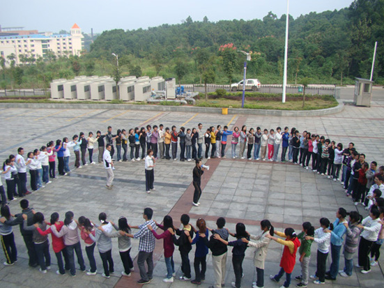 最后则是富有挑战性和残酷性的拓展项目。项目一为:女皇圈,所有队员按要求围成一个圆圈,之后队员坐到后一名的腿上,挑战30分钟算成功。这个活动主要是培养新生的团队意识、整体意识;培养新生团结一致、密切配合,共同克服困难的团队精神;培养新生做事的计划性;让新生认识到沟通的重要性,培养良好的团队沟通能力;总结经验,加强团队学习的能力;了解认真严谨的态度与积极心态的重要性。项目二为:组队,以各班为单位,确立队长、副队长、队名、队训、队歌以及队形。项目三为:领袖风采;由各队分别报数,输家领袖罚做俯卧撑。这个游戏主要是为了让领袖真正挑起所带领的团队的责任,培养团队成员的责任感,让所有人为自己负起一个完全责任。树立主人翁意识,建立“班级就是我的家”的氛围,培养“每个班的大成功就是每个同学小成就积累”的积极心态。随后做了分享总结。