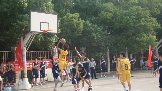 8:35,第一节比赛正式开始,队员们整装上阵,进攻,卡位,抢篮板,表现突出,拉拉队活力四射,高举班旗,为本班队员加油呐喊。首先,新闻队得到控球权,来势迅猛,广电队也不甘示弱,与其强烈对决。8:47,第一节比赛结束,现场比分情况是15:2,广电班落后13分。