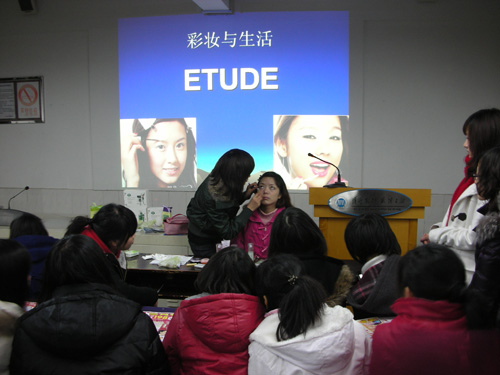 整个讲座在十分轻松活泼的氛围中进行。开始,“beauty·妆园”的三位美容护肤老师以轻松幽默的语言为广大女生解疑释惑,讲解了一些美容护肤的基础性知识,现场不时发出恍然大悟的感叹声。随后,老师现场为模特化了一个自然的小烟熏,让所有人眼前一亮,为活动带了高潮。大家在惊叹化妆带来的巨大改变的同时,更多地是积极地向老师请教化妆的技巧。最后,讲座在惊喜不断的抽奖和礼品派送中完美结束。
