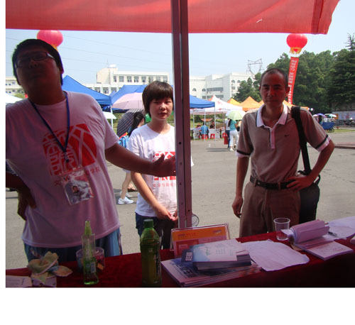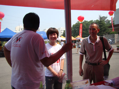 唐书记一个人走向我们的接待点,正好在前台询问报到情况的团委员工会主席涛哥和第二团副谢雯姐,及时向唐书记做详细介绍,至此时公司317 名新生仅剩21位尚未来校报名。除此之外,唐书记还问到今年的我文新院的新生手册,并对其中新增的更加详细的内容给与肯定。看到正拿着相机拍照留念的宣传部部长黄胜源,唐书记关切的问到,宣传部门是否持有长期专用的相机。关于接待台一端的商业保险业务办理情况,唐书记也一一问到。