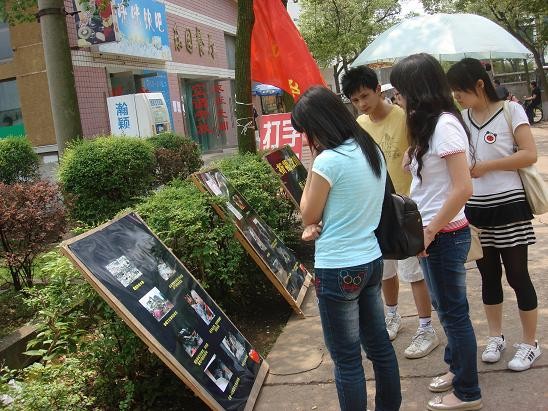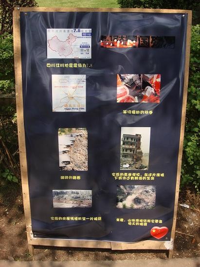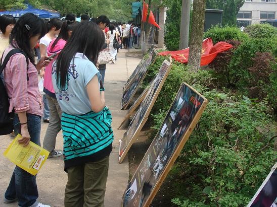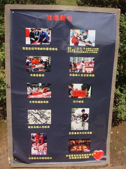图片展共分为10个展板。每张图片具有很强的冲击力和震撼力,用真实清晰的画面向广大师生诉说着灾情的严重以及救灾抗灾的紧迫。地震后破败不堪的房屋、残垣断壁的里那只渴望救助的手、母亲在失去孩子后撕心裂肺的恸哭,冲击着人的眼球,刺激着人的神经,让你的眼睛不由的慢慢变红变红。社会各界的广泛救助,绿色军人,白色的医生,橙红色的消防战士,还有那些献血者和募捐人这些又让我们看到了战胜灾害的信心。家宝总理的热泪和那振臂的呼喊的镜头更是让我们看到了战胜灾难的党和政府这最坚强的后盾。展板前挤满观看的同学,许多原本匆忙的脚步也在次停下,大家在默默的看着。