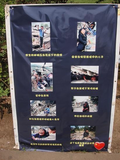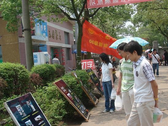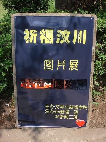 (本网讯)“有这样关心人民的好总理,有社会各界的关注和支持,有全国人民众志成城齐心协力的斗志,我们一定能够战胜这场地震灾难。”一个女生在看完“祈福汶川”图片展后,红着双眼说。近日,06级新闻班在北苑举行了“祈福汶川” 的大型图片展,有很多同学驻足观看。