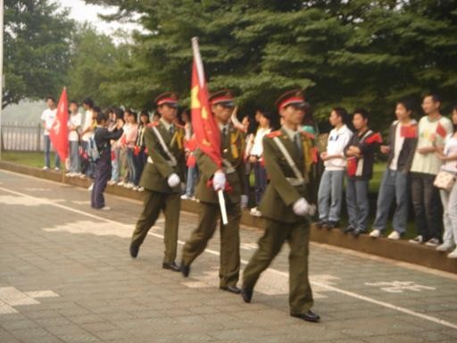 (本网讯 孙丽娜)5月19日早晨,一教门前,国旗护卫队照常为周一的升旗操练着。不同的是旗杆下的路旁多了齐齐的两列同学——sunbet申搏06级广播电视新闻一班统一着班服的同学,他们手中挥舞着小国旗,左臂上贴着心型国旗徽标。在06广电一班的带动下,07级广电一班的同学也加入到升旗仪式的队伍中来。6点在三教门前集合,赶到一教门前,同学们的热情可见一斑。