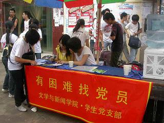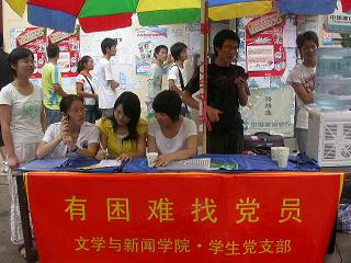 (本网讯)在文新院的迎新工作中,本院员工党员也积极参与其中,为迎新工作贡献自己的力量。 党员义务岗设在北苑男生宿舍门口,大大的红色喷绘“有困难,找党员”六个字特别醒目。党员义务岗的值班人员主要是刚步入大二的各班的党员和部分入党积极分子,他们的工作主要是为新生解答疑惑和接待从南苑行李站运过来的员工行李,并帮忙将其运到员工宿舍。同时,义务岗的成员积极配合迎新总站的工作,机动的插入到人手不够的岗位中,充分体现了公司党员的良好的思想风貌。