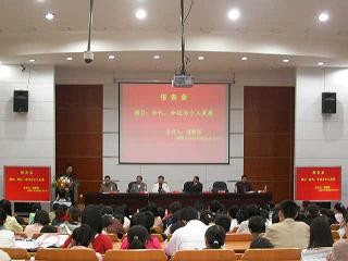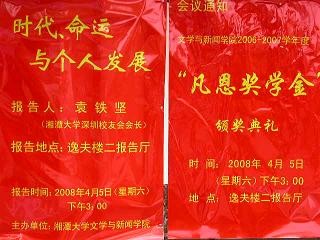 接下来, 袁铁坚先生做了主题为“时代、命运与个人发展”的报告。他从立志、脚踏实地、专业知识和技能、感恩四个方面给同学们以启迪。他说到了“丛林原则”——谁跑地慢,谁就可能被淘汰,告诉大家要有奋力拼搏的勇气,说到“家文化”时,他跟大家分享了社会责任和人文情怀的思想。袁先生结合自己的创业经历及王石、史玉柱等企业家的经历,分析了创业与企业发展对一个人的高素质要求,并鼓励同学们持自信之心,发挥个人潜力,去实现自己的目标。袁先生在报告最后改用苏格兰诗人的一句著名的“我的爱人是一朵红红的玫瑰,我的心在高原”——“我的爱人是永远的湘大,我的心在这片黄土地上”,经典的表达了他对母校的感情。