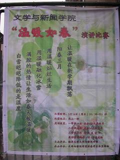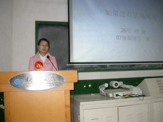 16日晚8时45分,北山一阶梯教室座无虚席,准备了近半个月的“温暖如春”演讲比赛如期举行。到场的嘉宾评委有公司团委书记覃岚老师、杨向荣博士、沈云霞博士、院团委员工会第一副书记傅海勤、团委员工会常务副主席吴学旺。比赛在一个关于雪灾的短片后开始。共有28位选手参加本次比赛,其中05级1名选手、06级2名选手、07级25名选手,选手根据之前的抽签顺序依次演讲。