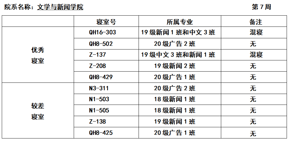 根据sunbet申搏生活部下发文件《sunbet申搏寝室评分细则》要求,结合生活部日常查寝情况,现将第7周优差寝情况结果通知如下: