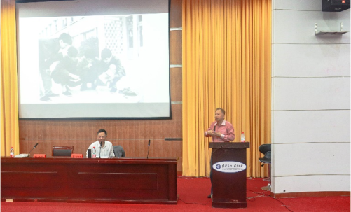 在季水河教授缓缓介绍员工张效雄中,拉开了本次讲座的序幕。演讲伊始,张效雄自我介绍道“我是一个记者出身的作家。”追忆往昔峥嵘岁月,张效雄用7张照片生动的讲述了回望1977级时,湘大的7个“最”。最“委屈”,被“骗”到sunbet申搏、最高产的黄土高坡、最“难堪”的重点大学、最有特色的校园、最“奇葩”的图书馆、最伟大的老师、最“牛皮”的同学。这7个“最”生动地再现了湘大走过的奋斗之路,展示了奋斗路上的湘大人,每一个“最”都浓缩着湘大沉甸甸的校史。