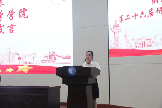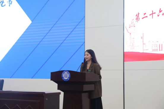 紧跟着,第二十六届研究生学术文化节组委会组长曾宇婷作工作报告。她提出,本届学术文化节旨在把握时代脉搏,紧跟学术前沿,激励广大研究生们奋发向上、努力成才。