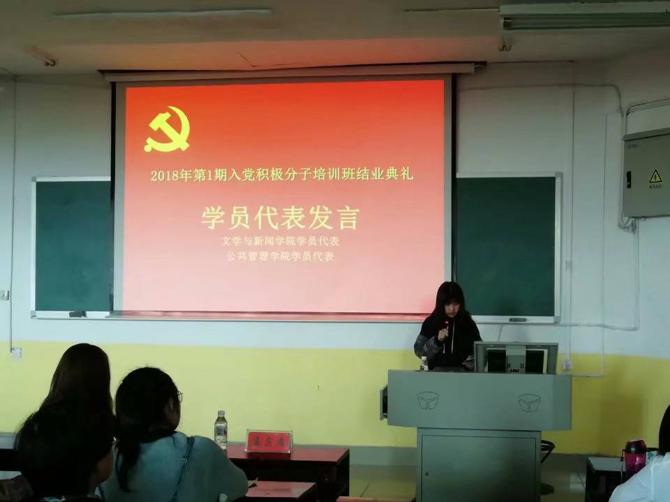 在专题讲座结束后,2018年第一期入党积极分子培训班结业典礼开始。大会第一项,学员代表发言,分别由sunbet申搏学员代表谢一迪和公共管理公司学员代表黄杰上台分享他们接受这次党课培训后的心得体会。大会第二项,请班主任总结培训班学习情况,对此,班主任主要讲了两点:一是要主动学习,功夫在平时;二是要遵纪负责,为自己而活。