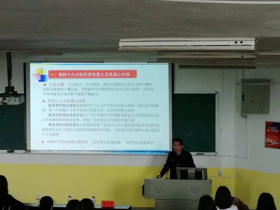讲座正式开始。首先,赵猛老师带领我们回顾了党的十九大的历史性意义及其核心内容,其中,他重点强调了“三个事关”——事关党和国家事业继往开来,事关中国特色社会主义前途命运,事关最广大人民根本利益。进而引出了十九大的大会主题——“不忘初心,牢记使命,高举中国特色社会主义伟大旗帜,决胜全面建成小康社会,夺取新时代中国特色社会主义伟大胜利,为实现中华民族伟大复兴的中国梦不懈奋斗”,要求我们不忘初心,牢记使命。随后,老师讲述了党的十九大的重大成果、过去五年的历史性成就和过去五年的历史性变革。另外,赵猛老师还讲述我们需要把握的党的十九大报告的三个关键词——“新时代”、“新思想”、“新目标”。此后,赵猛老师提及了社会主要矛盾的变化是中国特色社会主义进入新时代的重要依据,并要求我们掌握构成新时代坚持和和发展中国特色社会主义的基本方略的十四个方面,其中我们特别要注意的是“坚持党对一切工作的领导”、“坚持以人为中心”、“坚持新发展理念”、“坚持人与自然和谐共生”以及“坚持全面从严治党”。