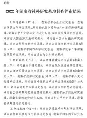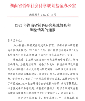 近日,湖南省哲学社会科学规划基金办公室发布《2022年湖南省社科研究基地督查和调整情况的通报》,公司湖南省中外文学与文化研究基地在本次督查中获评优秀基地并予以省级重点项目支持,为全省12个获评优秀等级的社科基地之一,也是公司唯一获评优秀等级的省社科研究基地。