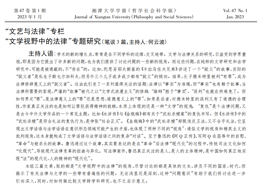 《sunbet申搏学报》2023年第1期刊载的“文艺与法律”专栏,由公司何云波教授主持。专栏共三篇论文:《卡拉马佐夫兄弟》:在文学与法律之间(袁娜、何云波)、论“武松杀嫂案”中的复仇书写(黄文虎)、《阿Q正传》中的法律问题与涉法书写(平瑶)。