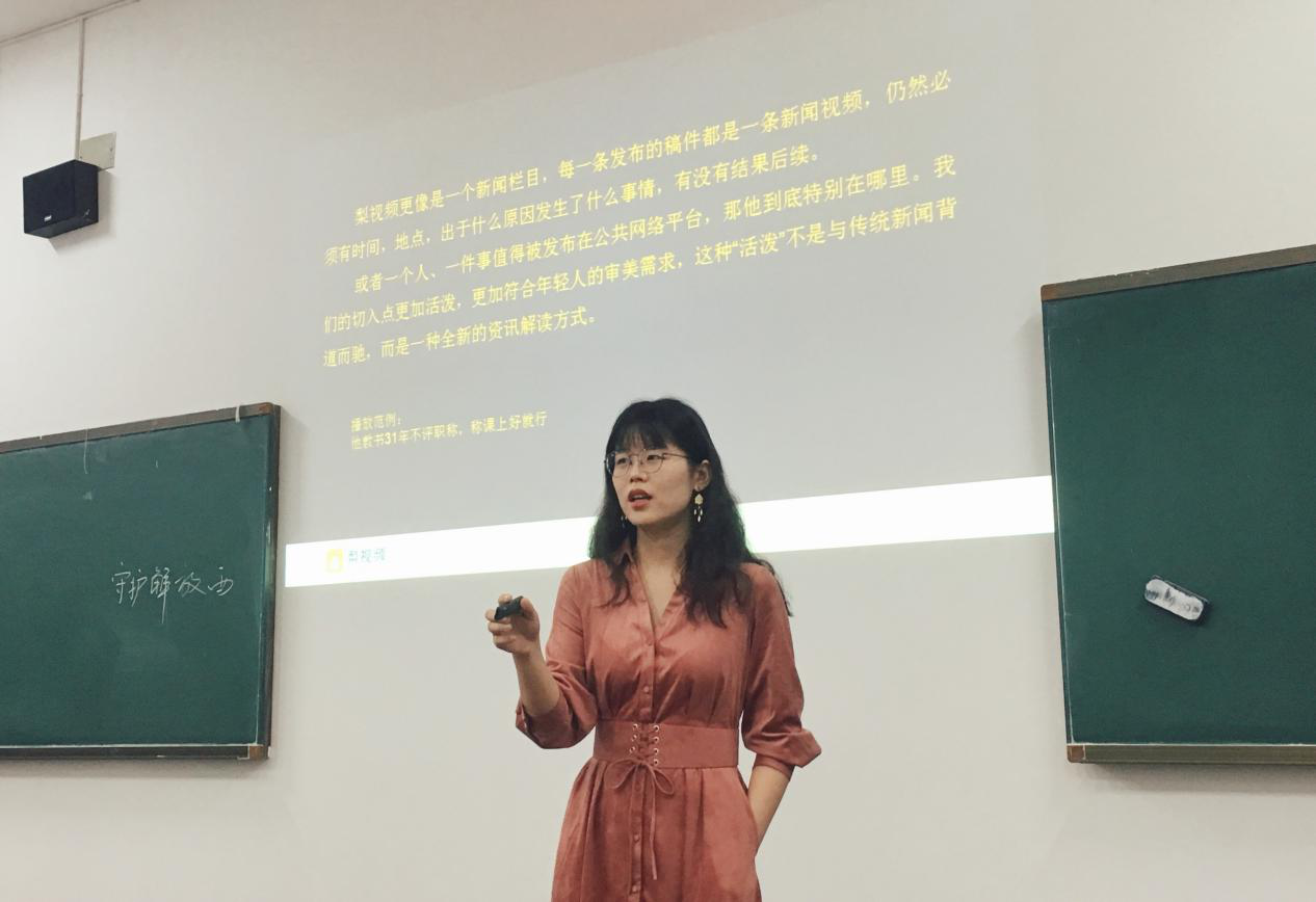 梁瑞玉老师毕业于湖南师范大学新闻与传播公司,在大三时就已成为梨视频的拍客,并在实践中逐渐掌握了拍视频的技巧。此次梁老师围绕着四个部分将她的干货分享给同学们,分别是“对梨视频稿件的分类”、“梨视频稿件的要素及特点”、“稿件质量:什么样的内容自带流量”、“拍摄中的常见问题”。