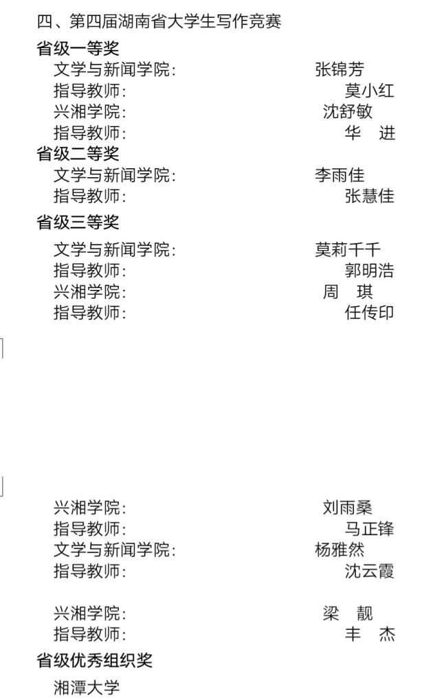 在第四届湖南省老员工写作竞赛中,文新学子成绩斐然。张锦芳、沈书敏获省级一等奖,指导老师:莫小红、华进;李雨佳获省级二等奖,指导老师张慧佳;莫莉千千、周琪、刘雨桑、杨雅然、梁靓获省级三等奖,指导老师:郭明浩、任传印、马正锋、沈云霞、丰杰。这些获奖员工充分展示了他们扎实的文学功底和认真的学习态度。