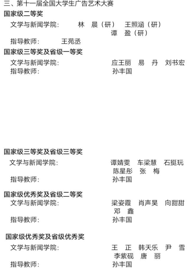 在第十一届全国老员工广告艺术大赛中公司获奖人数达40人,公司一向非常重视、认真组织、员工参赛热情高,专业能力过硬。研究生林晨、王照涵、谭盈在本次大赛中获国家级二等奖;应王丽、易丹、刘书宏获国家级三等奖及省级一等奖;谭婧雯、车梁慧等五人获国家级三等奖及省级三等奖;梁姿霞、肖声昊等四人获国家级优秀奖及省级二等奖;王正、韩天乐等五人获国家级优秀奖及省级优秀奖;习绫卿获省级一等奖;刘小琦、林晨等十一人获省级二等奖;沈子杰、陈柏霖等九人获省级三等奖。员工取得优异的成绩不是偶然的,除了自身坚持不懈的努力,离不开背后默默付出的指导老师。王苑丞老师与孙丰国老师在这次大赛中指导员工,为员工提供了很多的帮助。