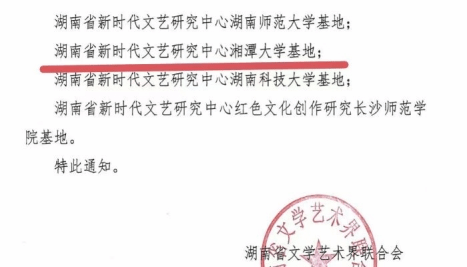 近日,湖南省文学艺术界联合会发布了《湖南省文学艺术界联合会关于设立文艺创研基地的通知》,“湖南省新时代文艺研究中心sunbet申搏基地”位列其中。